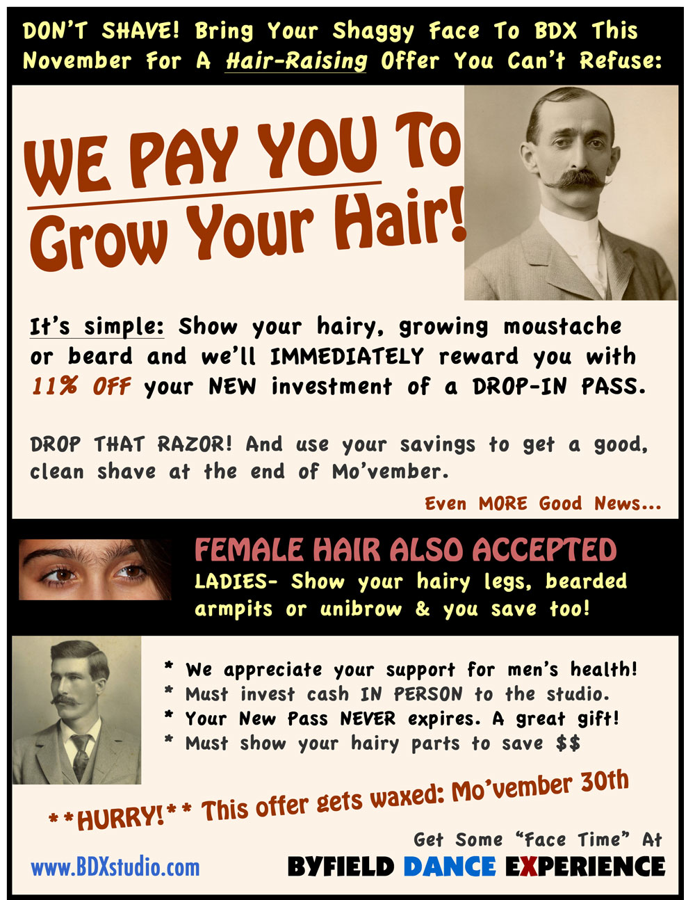 **HURRY!** This offer gets waxed: Mo’vember 30th.